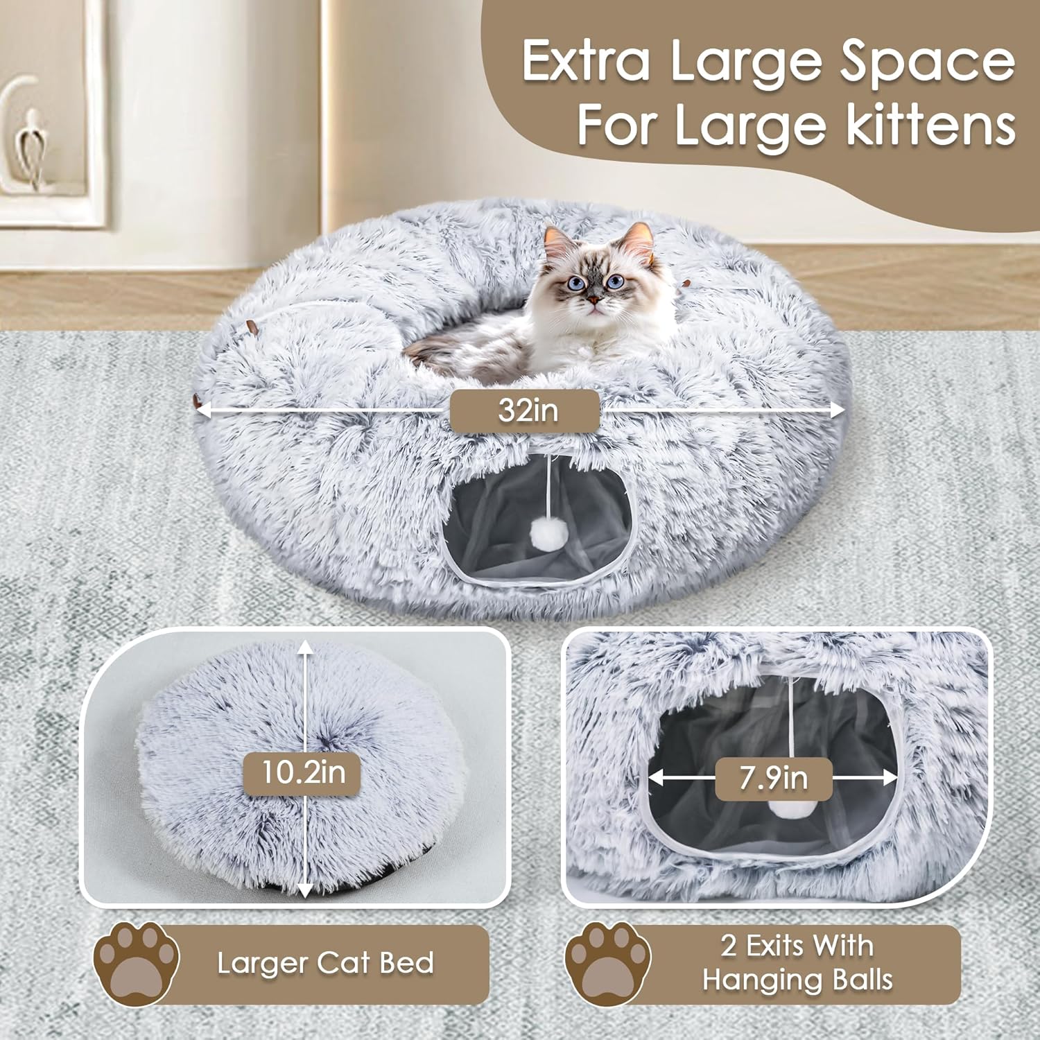Cat Tunnel Bed For Indoor Cats Peekaboo Cat Cave With Washable Soft Play Mat Furry Cat Tube For Kitten Puppy Rabbit Grey